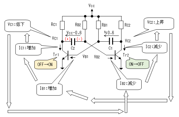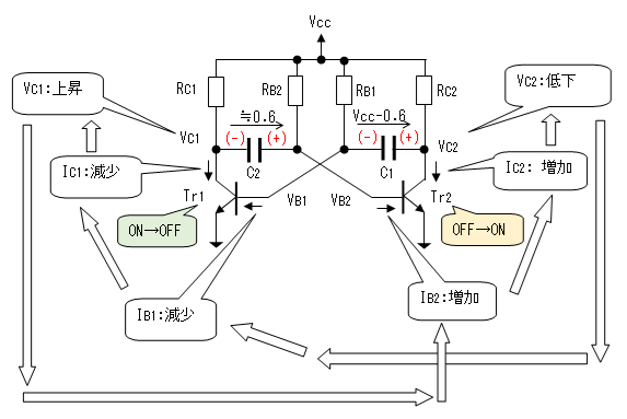 Tr1とTr2が交互にON/OFFを繰り返えしながら、発振を継続するようになります。