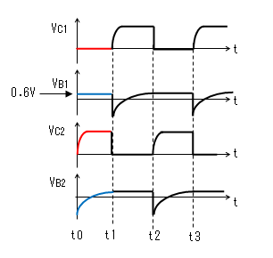 そして、Tr2のベース電圧VB2が0.6V位に接近すると、t=t1において