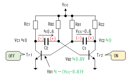 コンデンサ(C2)の両端の電圧は(Vcc - 0.6)[V]なので、Tr2のベース電圧