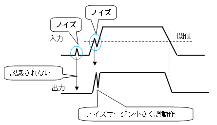 最初と同じ大きさのノイズが乗ると、閾値を超えてしまい誤動作となります。