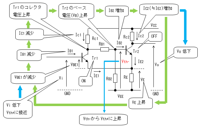 上記の遷移動作が起きると、今度は入力電圧(Vi)がVth-まで低下しないと
