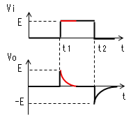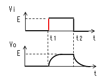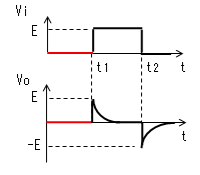 時定数がパルス幅より十分 小さいと、時刻がt2になる前に コンデンサーがVc≒Eまで充電 されます。よってVo=E-Vc≒0、 I=Vo/R≒0になります。 |