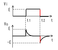 時刻t2で入力(Vi)がVi=0に 立ち下がります。 コンデンサー(C)はすぐに放電 しないので、この瞬間のVcは Eのままです。よって出力電圧 (Vo)は−Eに立下がります。 コンデンサーから抵抗に電流が 流れ始めますが、この瞬間の 電流Iは|I|≒E/Rです。 |