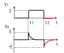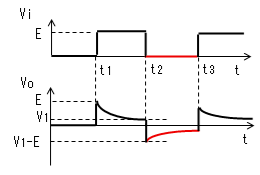 時刻t2で入力(Vi)がVi=0に 立ち下がります。 コンデンサー(C)はすぐに放電 しないので、この瞬間のVcは (E-V1)のままです。よって出力電圧 (Vo)は(V1−E)に立下がります。 |