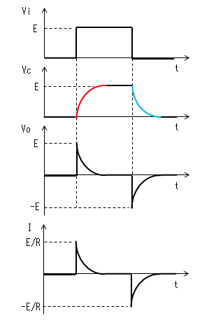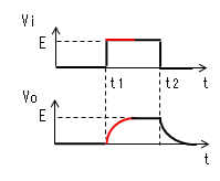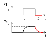 時刻t1で入力(Vi)がVi=Eに 立ち上がります。 コンデンサー(C)はすぐに充電 しないので、この瞬間のVcは 0のままです。よって出力電圧 (Vo)もEに立上がります。 コンデンサーから抵抗に電流が 流れ始めますが、この瞬間の 電流IはI=E/Rです。 |