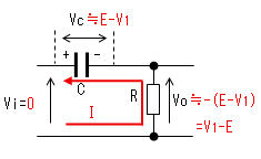 電流Iによりコンデンサーが放電 するのでVcは(E-V1)から次第に 小さくなります。Vcが小さくなる とVoは(V1-E)から次第に0に近づき ますが、t3になっても0には なりません。また、定常状態では VoはEに達しません。 |