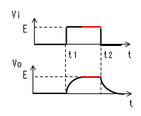 電流Iによりコンデンサーが充電 されるのでVcは0から次第に 大きくなりますが、t2になっても Eまで充電しきれず、VoはV1まで しか低下しません。 |