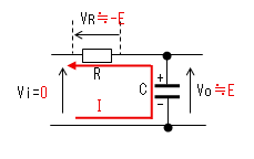時刻t2で入力(Vi)がVi=0に 立ち下がります。 コンデンサー(C)はすぐに放電 しないので、この瞬間のVoは Eのままです。 コンデンサーから抵抗に電流が 流れ始めますが、この瞬間の 電流Iは|I|≒E/Rです。 |