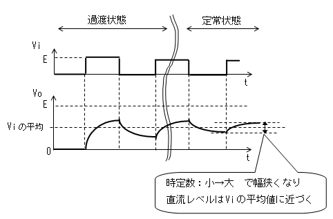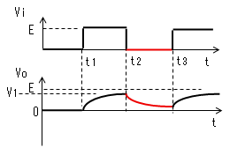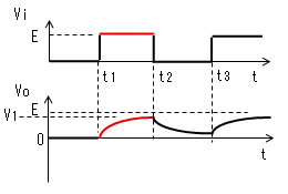 電流Iによりコンデンサーが放電 するのでVoはV1から次第に 小さくなり0に近づきますが、 t3になっても0にはなりません。 よって、定常状態では VoはEと0の間を行き来します。 |