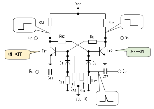 負極性 | トリガをベースに印加するので トランジスタの 増幅作用により トリガの電力が少なくて済む。 この裏返しとして、ノイズに やや敏感となる。 |