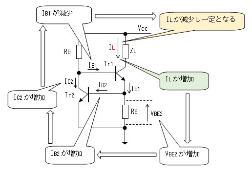VBE2が減少 → Tr2のベース電流(IB2)が減少 → IC2が減少 →