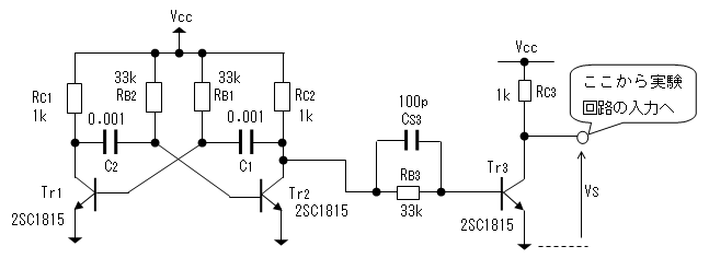 実験回路の応答特性が正確に判りません。本来は、非安定マルチバイブレータの出力を